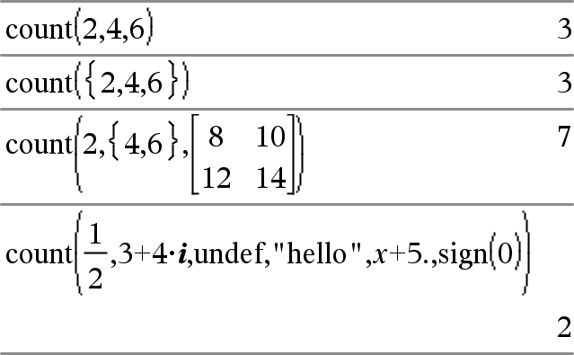 count(Valeur1ouListe1 [,Valeur2ouListe2[,...]])Þvaleur Affiche le nombre total des éléments dans les arguments qui s'évaluent à des valeurs numériques. Un argument peut être une expression, une valeur, une liste ou une matrice. Vous pouvez mélanger les types de données et utiliser des arguments de dimensions différentes. Pour une liste, une matrice ou une plage de cellules, chaque élément est évalué afin de déterminer s'il doit être inclus dans le comptage. Dans l'application Tableur & listes, vous pouvez utiliser une plage de cellules à la place de n'importe quel argument. Les éléments vides sont ignorés. Pour plus d'informations concernant les éléments vides, reportez-vous à la ici. |
