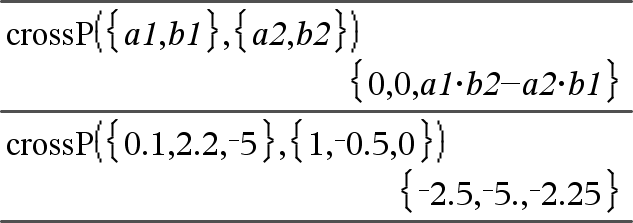 crossP(Liste1, Liste2)Þliste Donne le produit vectoriel de Liste1 et de Liste2 et l'affiche sous forme de liste. Liste1 et Liste2 doivent être de même dimension et cette dimension doit être égale à 2 ou 3. |
