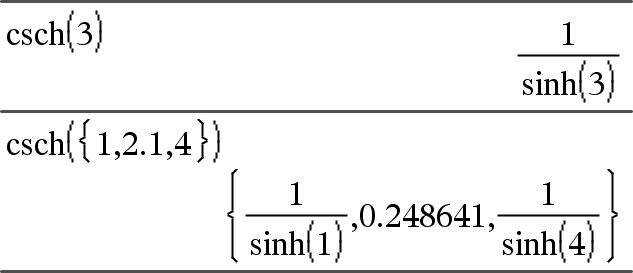 csch(Expr1) Þ expression csch(Liste1) Þ liste Affiche la cosécante hyperbolique de Expr1 ou donne la liste des cosécantes hyperboliques de tous les éléments de Liste1. |