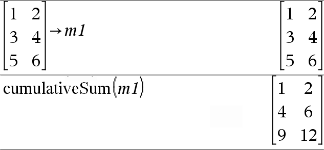 cumulativeSum(Matrice1)Þmatrice Donne la matrice des sommes cumulées des éléments de Matrice1. Chaque élément correspond à la somme cumulée de tous les éléments situés au-dessus, dans la colonne correspondante. Un élément vide de Liste1 ou Matrice1 génère un élement vide dans la liste ou la matrice résultante. Pour plus d'informations concernant les éléments vides, reportez-vous à la ici |
