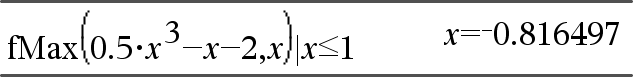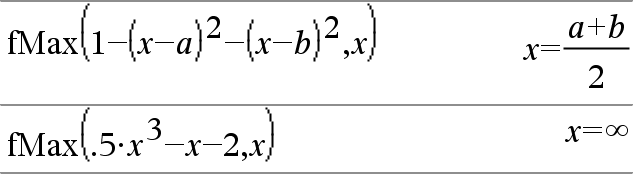 Vous pouvez utiliser l'opérateur "sachant que" (« | ») pour restreindre l'intervalle de recherche et/ou spécifier d'autres contraintes. Avec le réglage Approché (Approximate) du mode Auto ou Approché (Approximate), fMax() permet de rechercher de façon itérative un maximum local approché. C'est souvent plus rapide, surtout si vous utilisez l'opérateur « | » pour limiter la recherche à un intervalle relativement réduit qui contient exactement un maximum local. Remarque : voir aussi fMin() et max(). |