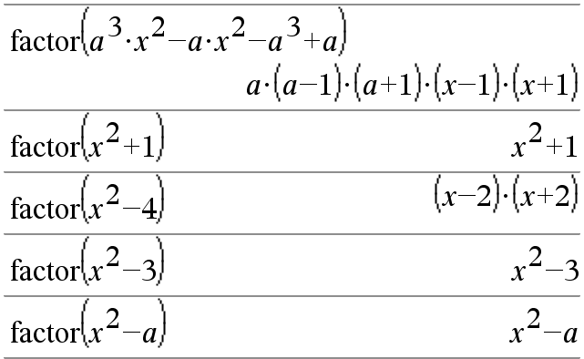 Avec le réglage Auto du mode Auto ou Approché (Approximate), l'utilisation de Var permet également une approximation des coefficients en virgule flottante dans le cas où les coefficients irrationnels ne peuvent pas être exprimés explicitement en termes de fonctions usuelles. Même en présence d'une seule variable, l'utilisation de Var peut contribuer à une factorisation plus complète. Remarque : voir aussi comDenom() pour obtenir rapidement une factorisation partielle si la fonction factor() est trop lente ou si elle utilise trop de mémoire. Remarque : voir aussi cFactor() pour une factorisation à coefficients complexes visant à chercher des facteurs linéaires. |