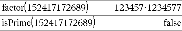 factor(nombreRationnel) factorise le nombre rationnel en facteurs premiers. Pour les nombres composites, le temps de calcul augmente de façon exponentielle avec le nombre de chiffres du deuxième facteur le plus grand. Par exemple, la factorisation d'un entier composé de 30 chiffres peut prendre plus d'une journée et celle d'un nombre à 100 chiffres, plus d'un siècle. Pour arrêter un calcul manuellement,