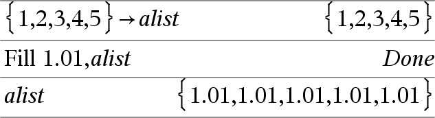 Fill Valor, VarLista Þlista Substitui cada elemento na variável VarLista por Valor. VarLista já tem de existir. |