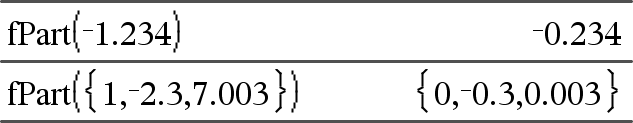 fPart(Expr1) Þexpressão fPart(Lista1) Þlista fPart(Matriz1) Þmatriz Devolve a parte fraccionária do argumento. Para uma lista ou matriz, devolve as partes fraccionárias dos elementos. O argumento pode ser um número complexo ou real. |