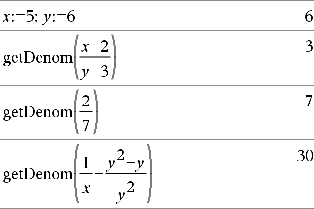 getDenom(Fracção1) Þvalor Transforma o argumento numa expressão que tem um denominador comum simplificado e, em seguida, devolve o denominador. |