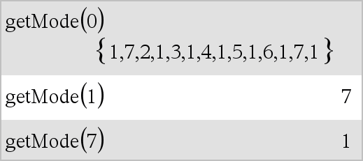 getMode(NúmeroInteiroNomeModo) Þvalor getMode(0) Þlista getMode(NúmeroInteiroNomeModo) devolve um valor que representa a definição actual do modo NúmeroInteiroNomeModo. getMode(0) devolve uma lista com os pares de números. Cada par é composto por um número inteiro do modo e um número inteiro da definição. Para uma listagem dos modos e das definições, consulte a tabela abaixo. Se guardar as definições com getMode(0) & var, pode utilizar setMode(var) num programa ou função para restaurar temporariamente as definições na execução da função ou do programa. Consulte setMode(), aqui. |
