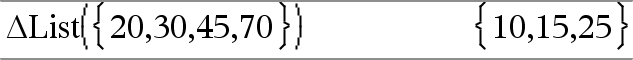 @List(Lista1) Þlista Nota: Pode introduzir esta função através da escrita de deltaList(...) no teclado. Devolve uma lista com as diferenças entre os elementos consecutivos em Lista1. Cada elemento de Lista1 é subtraído do elemento seguinte de Lista1. A lista resultante é sempre um elemento mais pequeno que a Lista1 original. |