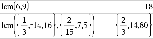 lcm(Número1, Número2) Þexpressão lcm(Lista1, Lista2) Þlista lcm(Matriz1, Matriz2) Þmatriz Devolve o mínimo múltiplo comum dos dois argumentos. O lcm de duas fracções é o lcm dos numeradores divididos pelo gcd dos denominadores. O lcm dos números de ponto flutuante fraccionários é o produto. Para duas listas ou matrizes, devolve os mínimos múltiplos comuns dos elementos correspondentes. |