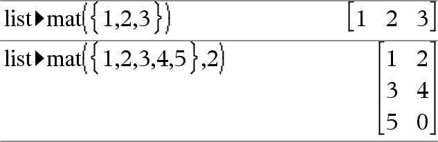 list4mat(Lista [, elementosPorLinha ]) Þmatriz Devolve uma matriz preenchida linha por linha com os elementos da Lista. elementosPorLinha, se incluído, especifica o número de elementos por linha. A predefinição é o número de elementos em Lista (uma linha). Se a Lista não preencher a matriz resultante, são adicionados zeros. Nota: Pode introduzir esta função através da escrita de list@>mat(...) no teclado do computador. |