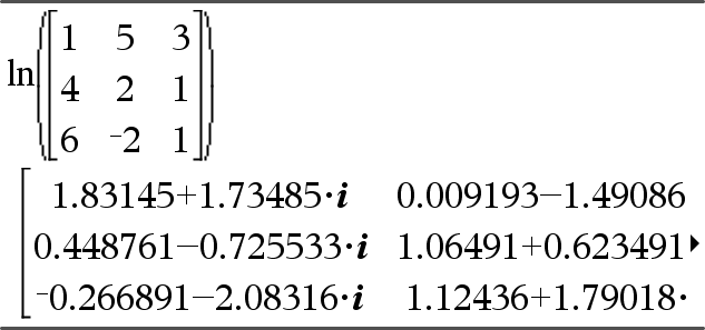 ln(MatrizQuadrada1) ÞMatrizQuadrada Devolve o logaritmo natural da matriz de MatrizQuadrada1. Isto não é o mesmo que calcular o logaritmo natural de cada elemento. Para mais informações sobre o método de cálculo, consulte cos() em. MatrizQuadrada1 tem de ser diagnolizável. O resultado contém sempre os números de ponto flutuante. |