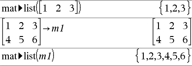 mat4lis t(Matriz) Þlista Devolve uma lista preenchida com os elementos em Matriz. Os elementos são copiados de Matriz linha por linha. Nota: Pode introduzir esta função através da escrita de mat@>list(...) no teclado do computador. |