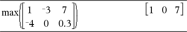 max(Matriz1) Þmatriz Devolve um vector da linha com o elemento máximo de cada coluna em Matriz1. Os elementos (nulos) vazios são ignorados. Para mais informações sobre os elementos vazios, consulte aqui. Nota: Consulte também min(). |