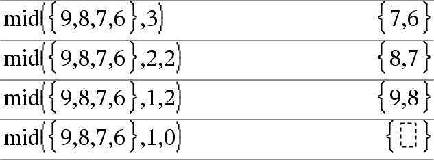 mid(ListaDeOrigem, Início [, Contagem ]) Þlista Devolve os elementos Contagem de ListaDeOrigem, começando pelo número de elementos Início. Se Contagem for omitida ou maior que a dimensão de ListaDeOrigem, devolve todos os elementos de ListaDeOrigem, começando pelo número de elementos Início. Contagem tem de ser | 0. Se Contagem = 0, devolve uma lista vazia. |