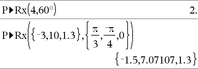 P4Rx(rExpr, qExpr) Þexpressão P4Rx(rList, qList) Þlista P4Rx(rMatrix, qMatrix) Þmatriz Devolve a coordenada x equivalente do par (r, q). Nota: O argumento q é interpretado como um ângulo expresso em graus, gradianos ou radianos de acordo com o modo de ângulo actual. Se o argumento for uma expressão, pode utilizar ¡, G ou R para substituir a definição do modo de ângulo temporariamente. Nota: Pode introduzir esta função através da escrita de P@>Rx(...) no teclado do computador. |