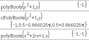polyEval(Lista1, Expr1) Þexpressão polyEval(Lista1, Lista2) Þexpressão Interpreta o primeiro argumento como o coeficiente de um polinómio de grau descendente e devolve o polinómio avaliado para o valor do segundo argumento. |