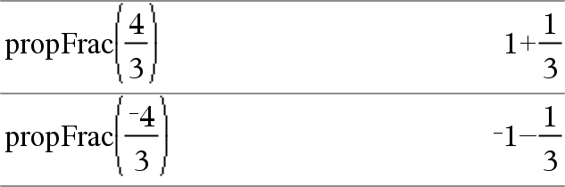 propFrac(Valor1 [, Var ]) Þvalor propFrac(rational_number) devolve rational_number como a soma de um número inteiro e uma fracção com o mesmo sinal e uma magnitudade do denominador maior que a magnitude do numerador. |