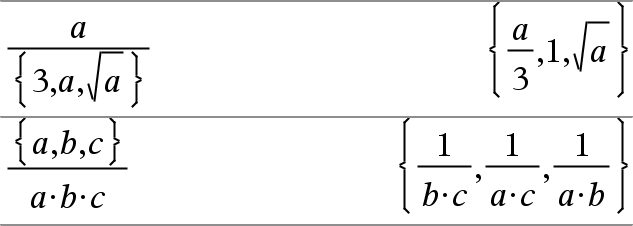 Lista1 à Expr Þ lista Devolve uma lista com os quocientes de Expr divididos pela Lista1 ou de Lista1 divididos pela Expr. |