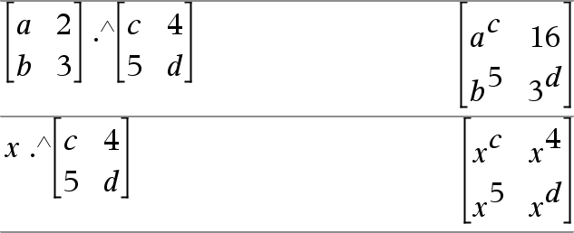 Matriz1 .^ Matriz2 Þ matriz Matriz1 .^ Matriz2 devolve uma matriz em que cada elemento em Matriz2 é o expoente para o elemento correspondente em Matriz1.