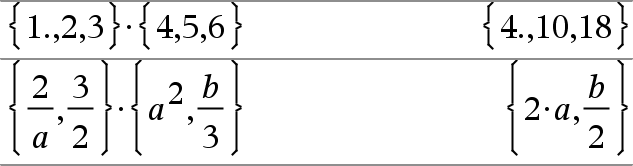 Matriz1 · Expr Þmatriz Devolve uma matriz com os produtos de Expr e de cada elemento em Matriz1. Nota: Utilize .· (ponto multiplicar) para multiplicar uma expressão por cada elemento. |