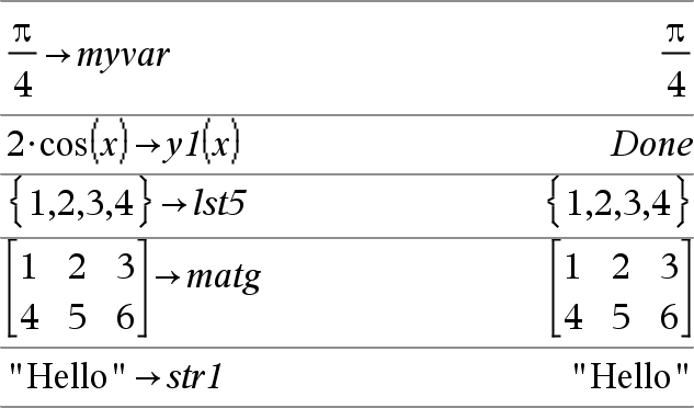 Lista & Var Matriz & Var Expr & Função(Parâm1,...) Lista & Função(Parâm1,...) Matriz & Função(Parâm1,...) Se a variável Var não existir, cria-a e inicia-a para Expr, Lista ou Matriz. Se a variável Var já existir e não estiver bloqueada nem protegida, substitui o conteúdo por Expr, Lista ou Matriz. Sugestão: Se planear fazer cálculos simbólicos com variáveis indefinidas, evite guardar o quer que seja nas variáveis de uma letra mais utilizadas, como a, b, c, x, y, z, e por aí adiante. Nota: Pode introduzir este operador através da escrita de =: no teclado como um atalho. Por exemplo, escreva pi/4 =: myvar. |
