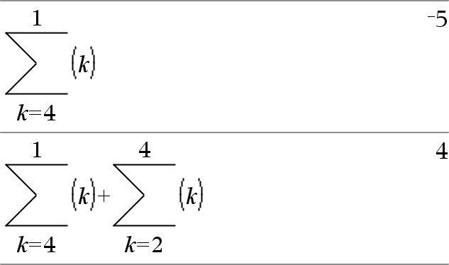 G(Expr1, Var, Baixo, Alto) Þexpressão Nota: Pode introduzir esta função através da escrita de sumSeq(...) no teclado. Avalia Expr1 para cada valor de Var de Baixo a Alto e devolve a soma dos resultados. Nota: Consulte também Modelo da soma, aqui. |
