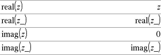 Variável_ Quando Variável não tiver valor, é tratada como se representasse um número complexo. Por predefinição, sem o _, a variável é tratada como real. Se Variável tiver um valor, o _ é ignorado e Variável retém o tipo de dados originais. Nota: Pode guardar um número complexo numa variável sem utilizar _. No entanto, para obter melhores resultados em cálculos como cSolve() e cZeros(), o _ é recomendado. |