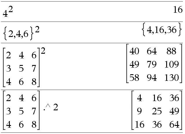 Devolve o quadrado do argumento. Lista1 2 Þ lista Devolve uma lista com os quadrados dos elementos em Lista1. MatrizQuadrada1 2 Þ matriz Devolve a matriz quadrada de MatrizQuadrada1. Isto não é o mesmo que calcular o quadrado de cada elemento. Utilize .^2 para calcular o quadrado de cada elemento. |
