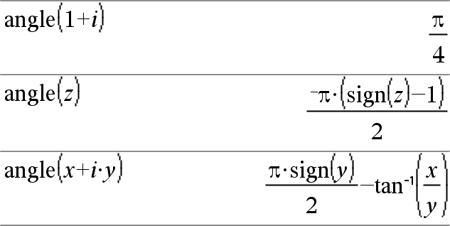 angle(Expr1) Þexpressão Devolve o ângulo do argumento, interpretando o argumento como um número complexo.