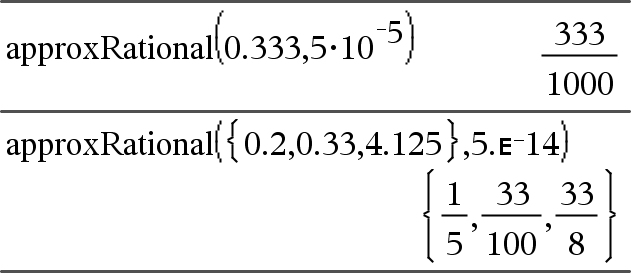 approxRational( Expr [ , Tol] ) Þexpressão approxRational( Lista [ , Tol] ) Þlista approxRational( Matriz [ , Tol] ) Þmatriz Devolve o argumento como uma fracção com uma tolerância de Tol. Se omitir Tol, é utilizada uma tolerância de 5.E-14. |