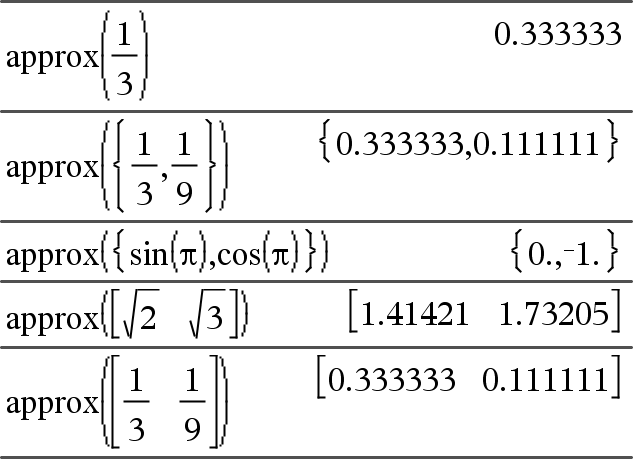 approx(Expr1) Þexpressão Devolve a avaliação do argumentos como uma expressão com valores decimais, quando possível, independentemente do modo Auto ou Aproximado actual. Isto é equivalente a introduzir o argumento e a introduzir / ·. |