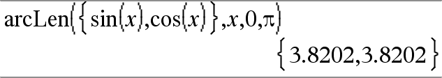 arcLen(Expr1, Var, Início, Fim) Þexpressão Devolve o comprimento do arco de Expr1 do Início ao Fim em relação à variável Var. O comprimento do arco é calculado como um integral que assume uma definição do modo de função. |