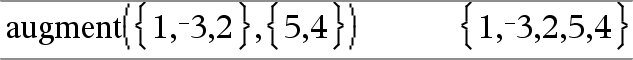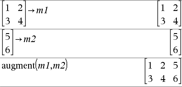 augment(Matriz1, Matriz2) Þmatriz Devolve uma nova lista que é a Matriz2 acrescentada ao fim da Matriz1. Quando utilizar o carácter “,”, as matrizes têm de ter dimensões de colunas iguais, e a Matriz2 é acrescentada à Matriz1 como novas colunas. Não altere Matriz1 ou Matriz2. |