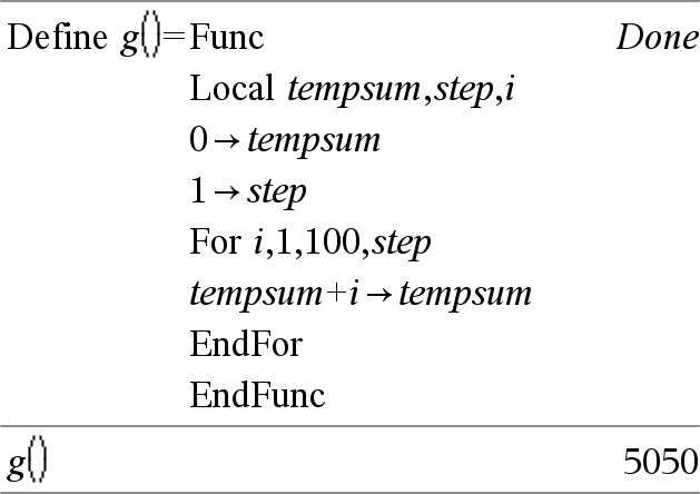 Func Bloco EndFunc Modelo para criar uma função definida pelo utilizador. Bloco pode ser uma declaração, uma série de declarações separadas pelo carácter “:” ou uma série de declarações em linhas separadas. A função pode utilizar a função Return para devolver um resultado específicos. Obs para introdução do exemplo: Para obter instruções sobre como introduzir programas com várias linhas e definições de funções, consulte a secção Calculadora do manual do utilizador do produto. |