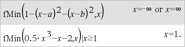 fMin(Expr, Var) ÞExpressão booleana fMin(Expr, Var, LimiteInferior) fMin(Expr, Var, LimiteInferior, LimiteSuperior) fMin(Expr, Var) | LimiteInferior{Var{LimiteSuperior Devolve uma expressão booleana que especifica os valores candidatos de Var que minimiza Expr ou localiza o maior limite inferior. Pode utilizar o operador de limite (“|”) para limitar o intervalo da solução e/ou especificar outras restrições. Para a definição Aproximado do modo Auto ou Aproximado, fMin() procura iterativamente um mínimo local aproximado. Isto é frequentemente mais rápido, em especial, se utilizar o operador “” para limitar a procura a um intervalo relativamente pequeno que contenha exactamente um mínimo local. Nota: Consulte também fMax() e min(). |
