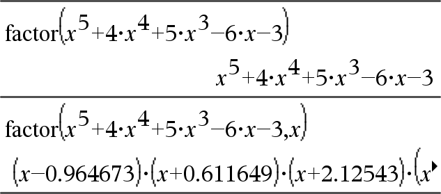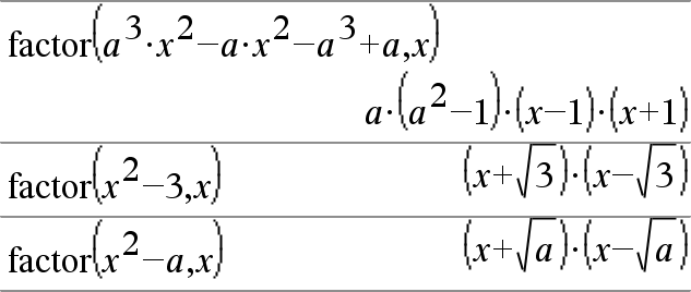 Para a definição Auto do modo Auto ou Aproximado, incluindo Var, permite também a aproximação a coeficientes de pontos flutuantes em que os coeficientes irracionais não podem ser expressos explicitamente em termos das funções integradas. Mesmo quando exista apenas uma variável, incluindo Var, pode produzir a factorização mais completa. Nota: Consulte também comDenom() para uma forma mais rápida para obter a decomposição de factores parcial quando factor() não for suficientemente rápido ou se a memória ficar esgotada. Nota: Consulte também cFactor() para decompor tudo para coeficientes complexos em busca de factores lineares. |