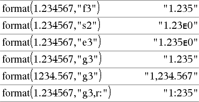 format(Expr [, CadeiaFormato ]) Þcadeia Devolve Expr como uma cadeia de caracteres com base no modelo do formato. Expr tem de ser simplificada para um número. CadeiaFormato é uma cadeia e tem de estar na forma: “F[n]”, “S[n]”, “E[n]”, “G[n][c]”, em que [ ] indica porções opcionais. F[n]: Formato fixo. n é o número de dígitos para visualizar o ponto decimal. S[n]: Formato científico. n é o número de dígitos para visualizar o ponto decimal. E[n]: Formato de engenharia. n é o número de dígitos após o primeiro dígito significante. O exponente é ajustado para um múltiplo de três e o ponto decimal é movido para a direita zero, um ou dois dígitos. G[n][c]: Igual ao formato fixo mas também separa os dígitos à esquerda da raiz em grupos de três. c especifica o carácter do separador de grupos e predefine para uma vírgula. Se c for um ponto, a raiz será apresentada como uma vírgula. [Rc]: Qualquer um dos especificadores acima pode ser sufixado com o marcador de raiz Rc, em que c é um carácter que especifica o que substituir pelo ponto da raiz. |