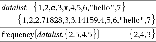 frequency(Lista1,Listabins) Þlista Devolve uma lista que contém as contagens dos elementos em Lista1. As contagens são baseadas em intervalos (bins) definidos em Listabins. Se Listabins for {b(1), b(2), …, b(n)}, os intervalos especificados são {?{ b(1), b(1)<?{ b(2),…,b(n-1)<?{ b(n), b(n)>?}. A lista resultante é um elemento maior que Listabins. Cada elemento do resultado corresponde ao número de elementos de Lista1 que estão no intervalo desse lote. Expresso em termos da função countIf(), o resultado é { countIf(list, ?{ b(1)), countIf(lista, b(1)<?{ b(2)), …, countIf(lista, b(n-1)<?{ b(n)), countIf(lista, b(n)>?)}. Elementos de Lista1 que não podem ser “colocados num lote” são ignorados. Elementos de Lista1 que não podem ser “colocados num lote” são ignorados. Os elementos (nulos) vazios também são ignorados. Para mais informações sobre os elementos vazios, consulte aqui. Na aplicação Listas e Folha de cálculo, pode utilizar um intervalo de células no lugar de ambos os argumentos. Nota: Consulte também countIf(), aqui. |
