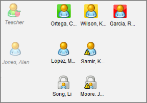 Em ambas as vistas, o sinal de aviso junto ao ícone de um aluno indica que o SO da unidade portátil do aluno não corresponde à versão de software do computador do professor. Ao mover o rato sobre o sinal de aviso, poderá abrir uma descrição a indicar que é necessário atualizar o SO.