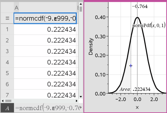 O exemplo a seguir utiliza a opção Desenhar da função normCdf() para representar um modelo de distribuição.
