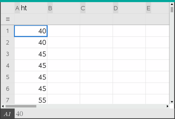 | 1. | Selecione a lista que pretende representar graficamente como um histograma. Por exemplo, pode introduzir ou recolher dados sob a forma de uma lista com nome numa página de Listas e Folha de cálculo. |