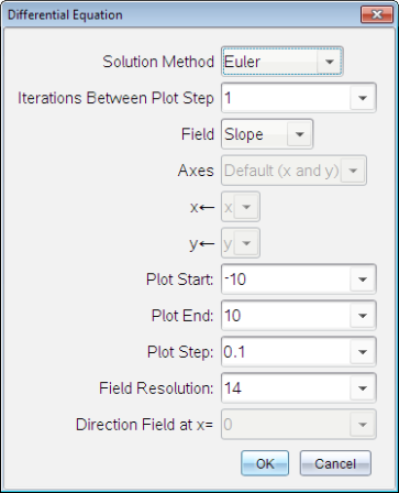 Inclinação - Marca um campo que representa a família de soluções para uma única ODE de primeira ordem. Tem de estar uma ODE ativa. Define Eixos para Predefinição  (x e  y). Define o eixo horizontal para x (a variável independente). Define o eixo vertical para y (a solução para a EDO).