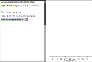 b) Introduza uma caixa de expressões matemáticas e defina os valores para o número de amostras (num) e a lista de médias das amostras (sampmeans). Tipo: