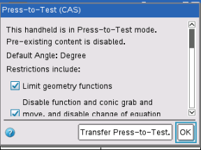 A unidade portátil guarda as definições e reinicia. Quando a reinicialização estiver concluída, é apresentada a seguinte caixa de diálogo para confirmar que a unidade portátil está no modo Premir para Testar. No TI-Nspire™ CX II, são também apresentados o Código de exame e o Modo CAS.