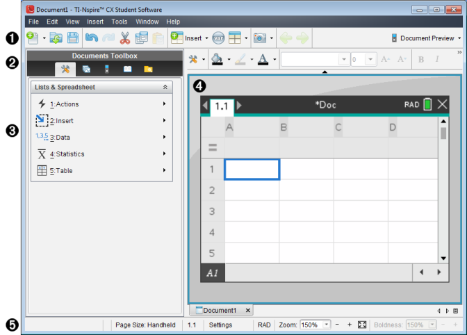 Nota: Apesar de não estar identificada, no Software para Estudantes TI-Nspire™ CX, a área de trabalho Documentos é a área de trabalho predefinida. Ao longo da documentação e ajuda, a área onde trabalha com documentos é referida como a área de trabalho Documentos.