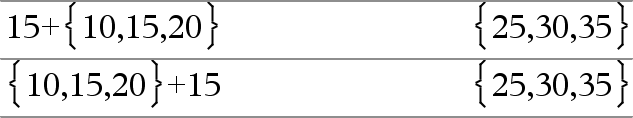 List1 + List2 ⇒ list Matrix1 + Matrix2 ⇒ matrix Returns a list (or matrix) containing the sums of corresponding elements in List1 and List2 (or Matrix1 and Matrix2). Dimensions of the arguments must be equal. |