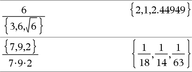 List1 ⁄ List2 ⇒ list Returns a list containing the quotients of List1 divided by List2. Dimensions of the lists must be equal. |