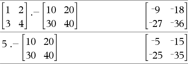 Matrix1.− Matrix2 returns a matrix that is the difference between each pair of corresponding elements in Matrix1 and Matrix2.