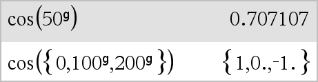 List1g ⇒ list Matrix1g ⇒ matrix This function gives you a way to specify a gradian angle while in the Degree or Radian mode. In Radian angle mode, multiplies Expr1 by π/200. In Degree angle mode, multiplies Expr1 by g/100. In Gradian mode, returns Expr1 unchanged. Note: You can insert this symbol from the computer keyboard by typing @g. |