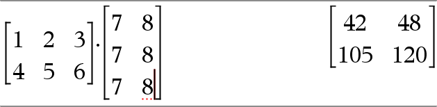 Matrix1•Matrix2 ⇒ matrix Returns the matrix product of Matrix1 and Matrix2. The number of columns in Matrix1 must equal the number of rows in Matrix2. |
